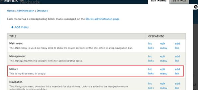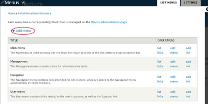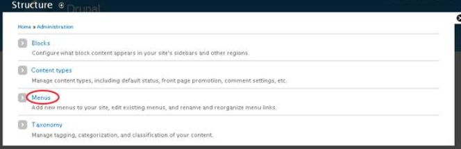 Step 1 − Click Structure → Menus as shown in the following screen.