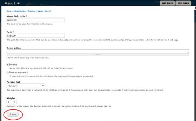 After filling all the information about the menu link, click the Save button, this will save your Menu link.